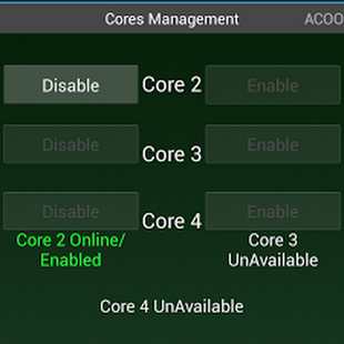 If you don't want to turn your cores ON and OFF again and again to both save battery and make your phone "usable", you can enable the awesome feature called ACOO (Automated CPU ON/OFF) which will automaticlly manage the mobile cores and turn off all the cores but one when your screen is OFF.